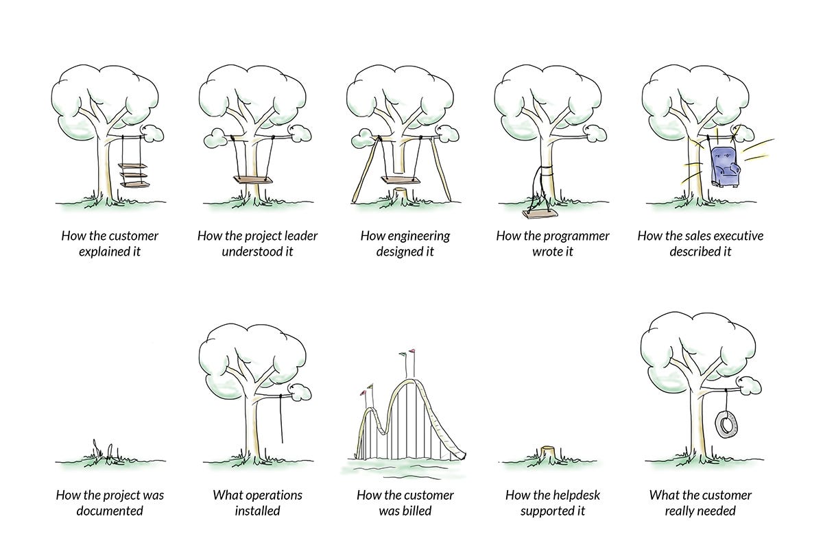 Personally, I’ve experienced how this doc makes a positive impact on different teams. It helps to create a balance between design, engineering, and product management to ensure that the product meets the goal. The lack of this vital document at the beginning of every project can lead to different assumptions about the desired outcome, as illustrated in the next image.