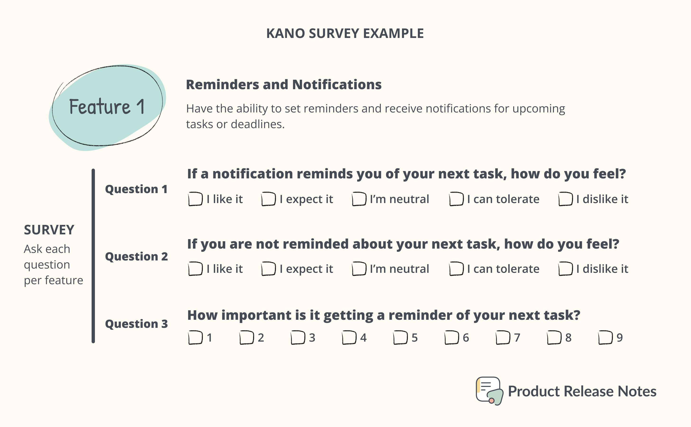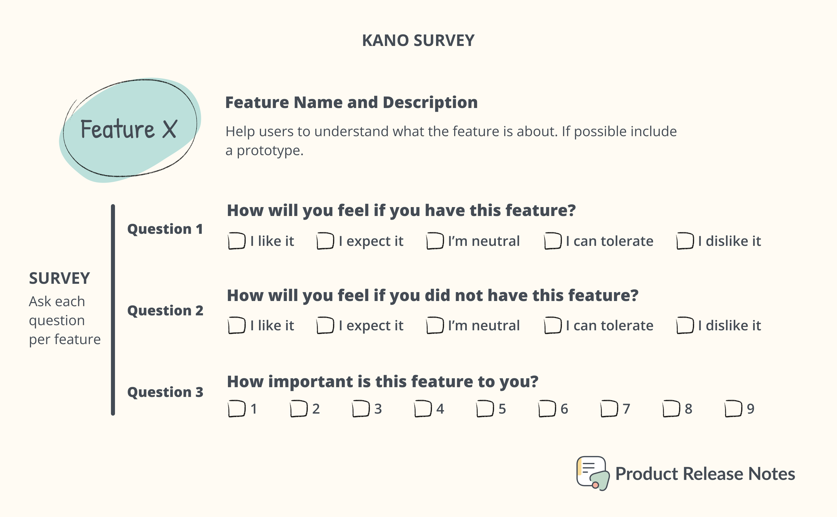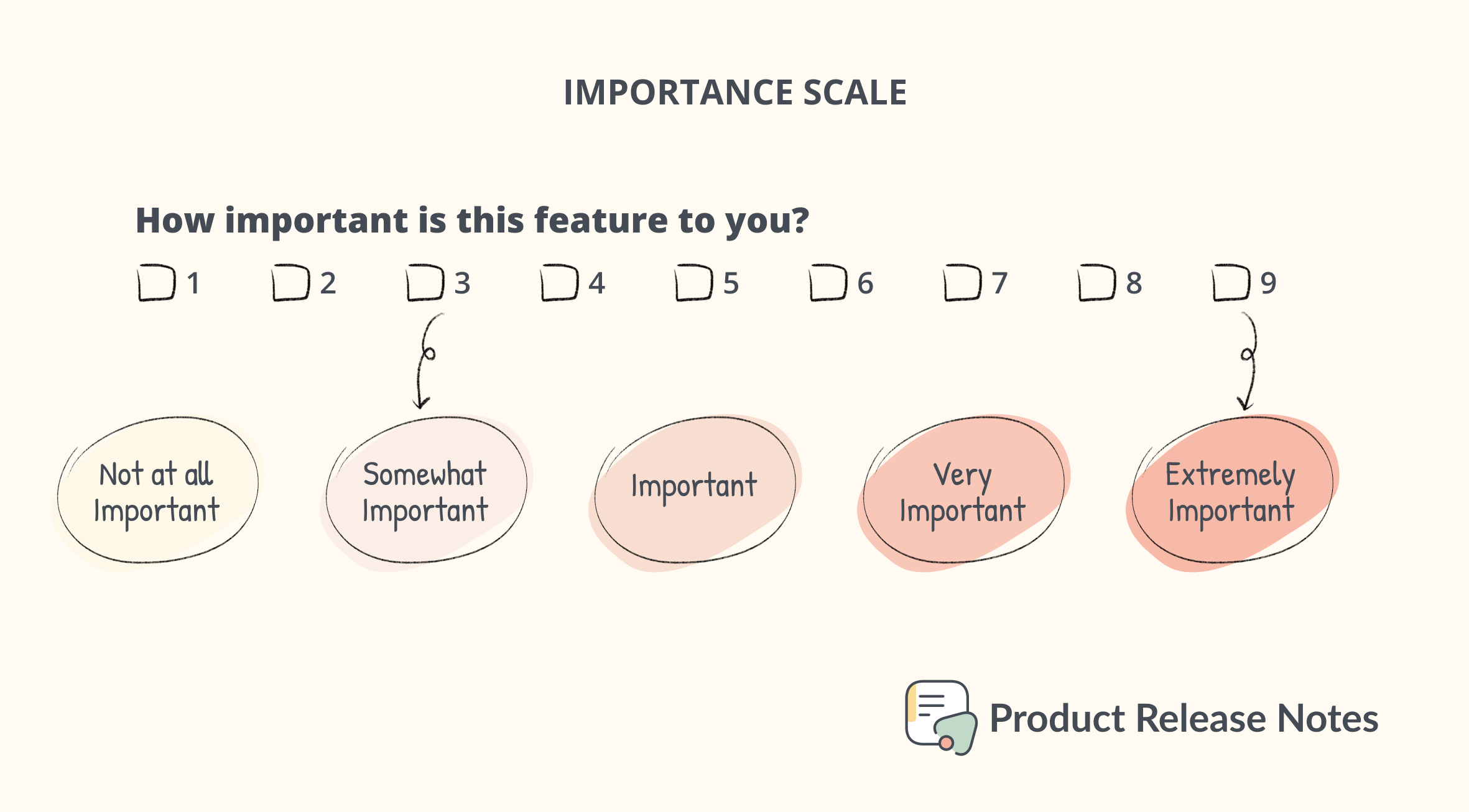For the importance aspect, include a question asking customers how important a feature is to them, as it can help distinguish relevant features from less important ones and understand their impact on customer decisions. Let the respondents to choose a number between 1 and 9 to measure it.