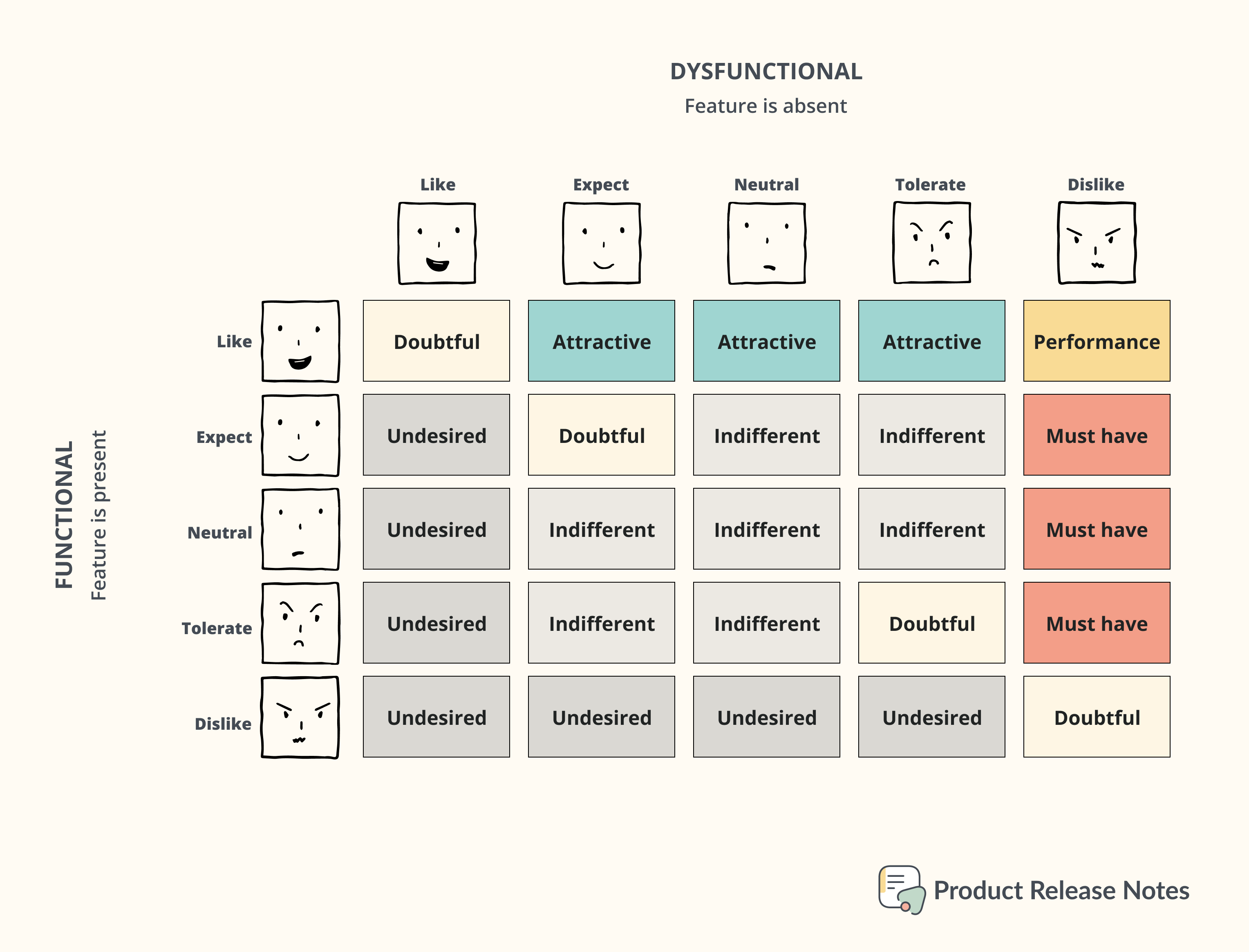 One of the coolest things of the Kano Model is that evaluates the importance of functionality and lack of functionality to determine customer needs. The following evaluation table is used to categorize the answers and determine customer preferences.