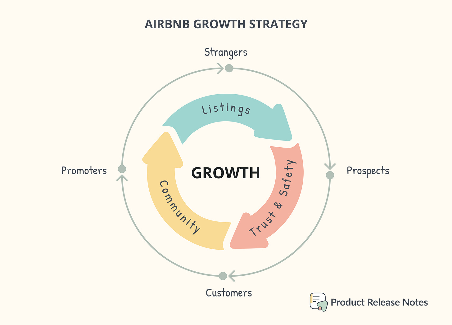 Airbnb's flywheel strategy revolves around "Property Listings," "Trust and Safety," and "User Community." Airbnb attracts hosts to list their properties on the platform (Property Listings) and establishes trust through robust safety measures (Trust and Safety). Satisfied guests contribute to the user community, writing positive reviews and attracting more hosts, completing the flywheel loop.