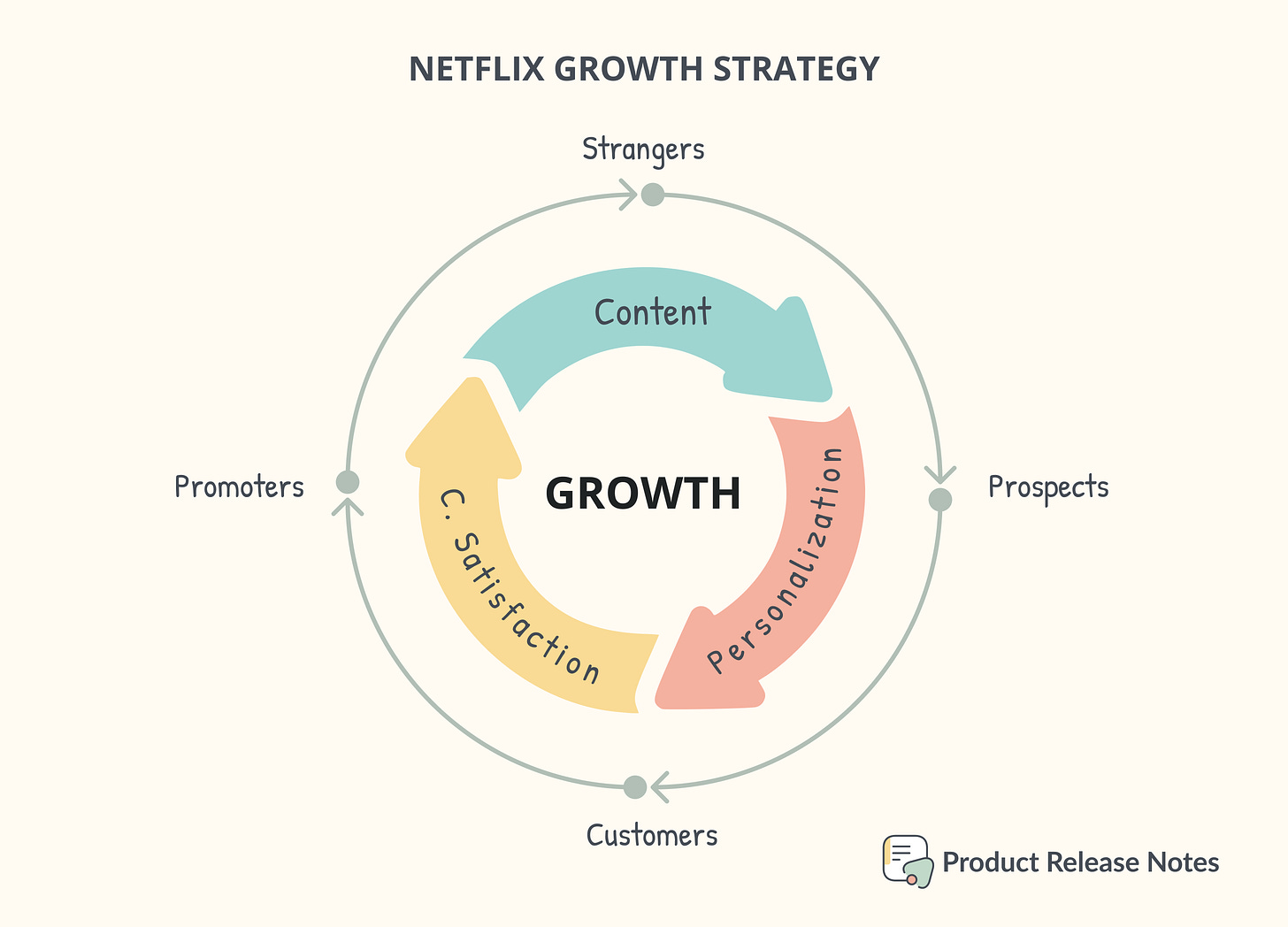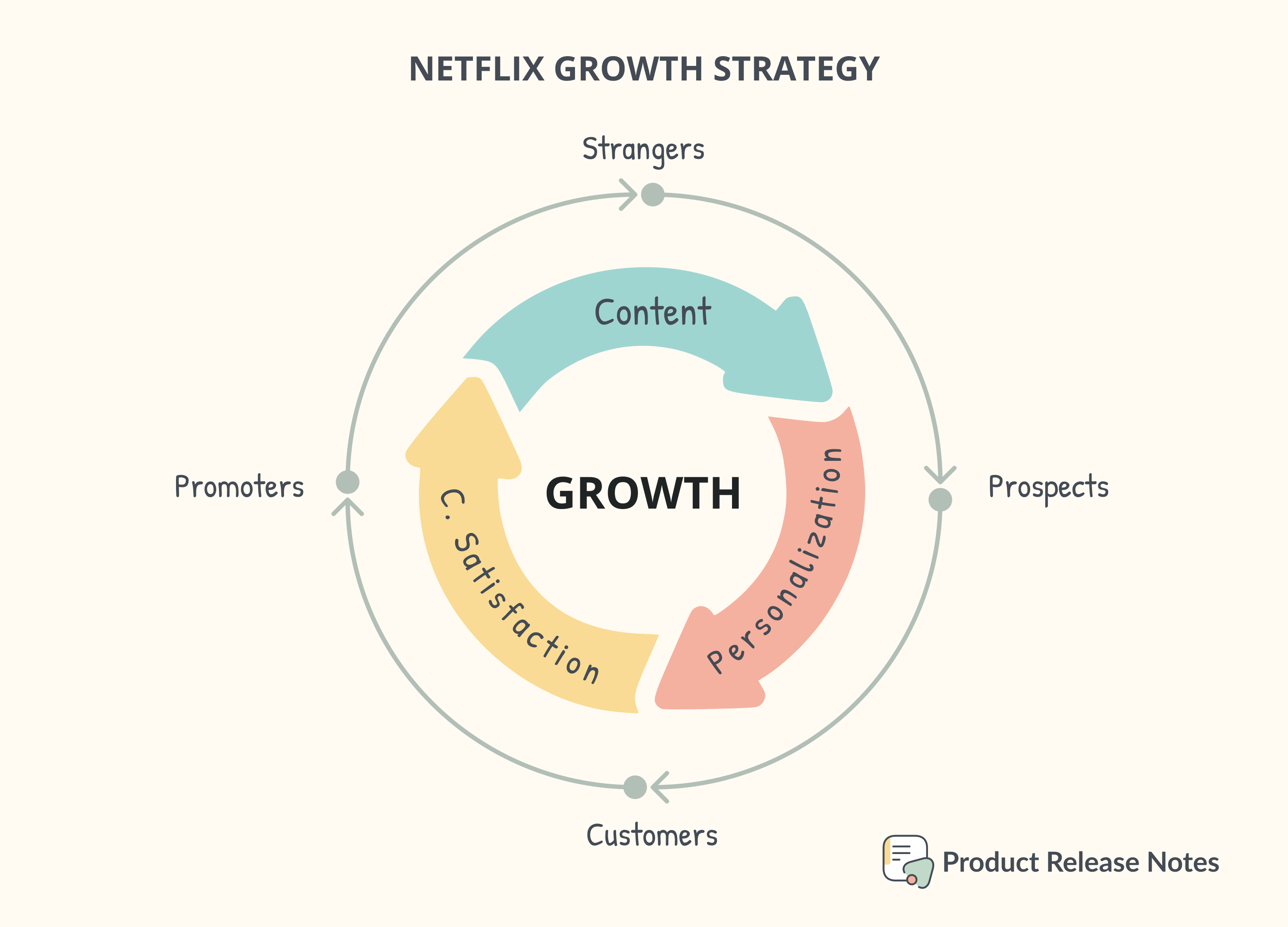 Netflix, the popular streaming service, has a flywheel strategy centered around "Content," "Personalization," and "Customer Satisfaction." By continuously investing in original and diverse content (Content), they attract and engage subscribers who get personalized content recommendations based on their viewing habits (Personalization). Satisfied customers are more likely to continue their subscriptions and recommend Netflix to others, driving further customer acquisition.