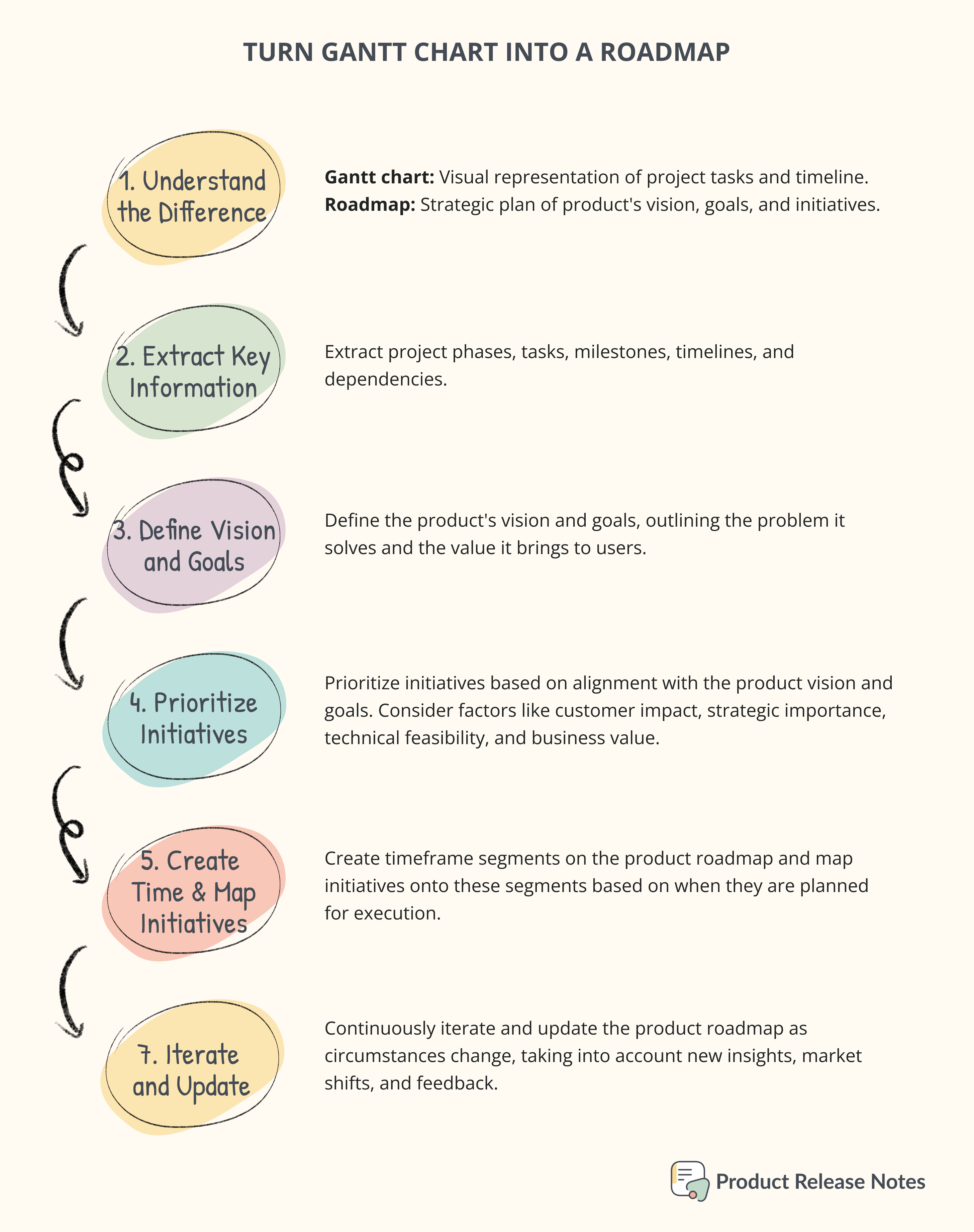 Converting a Gantt chart into a real product roadmap involves translating the timeline and tasks depicted in the Gantt chart into a strategic plan that outlines the overall direction, goals, and priorities for your product's development. Here's a step-by-step guide to help you achieve this: