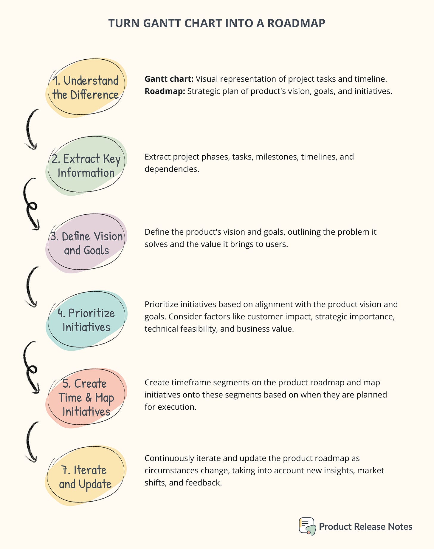 Review your Gantt chart and extract key information such as project phases, tasks, milestones, timelines, and dependencies. Identify the most important elements that need to be carried over to the product roadmap.