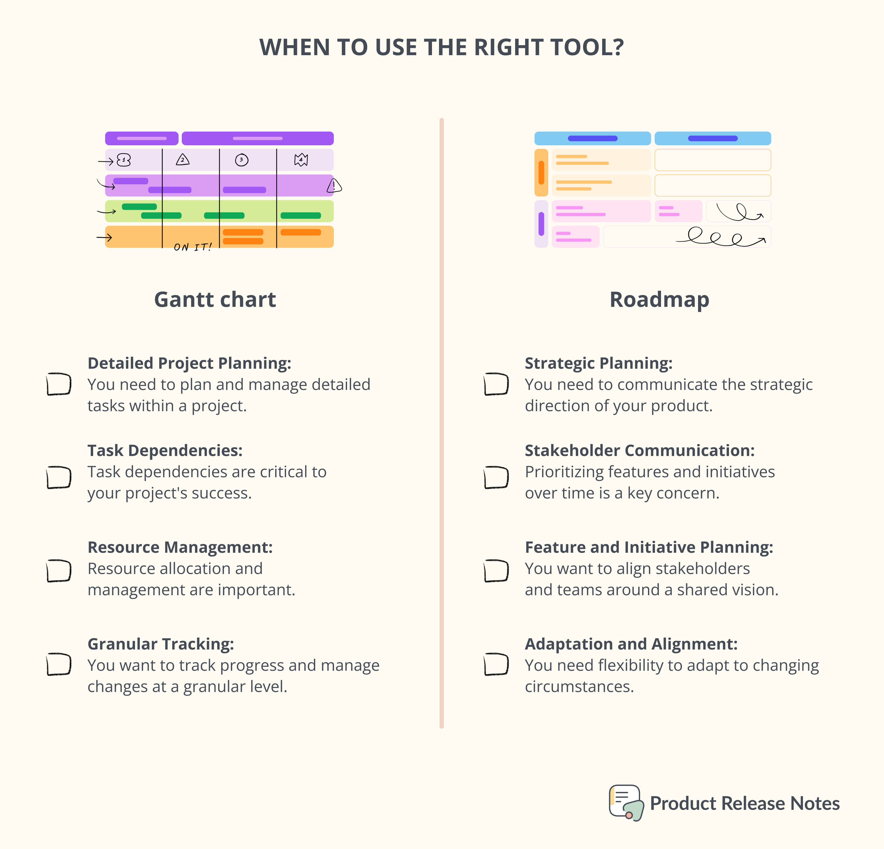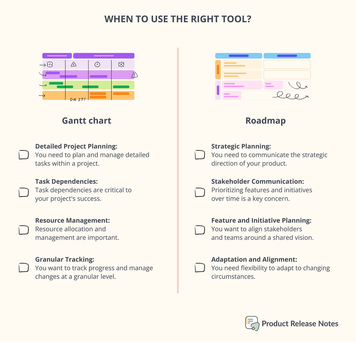 The decision to use a Gantt chart or a product roadmap depends on the purpose and stage of your project or product development. Each tool serves a different function, and understanding the characteristics of each will help you determine which one is more appropriate for your situation: